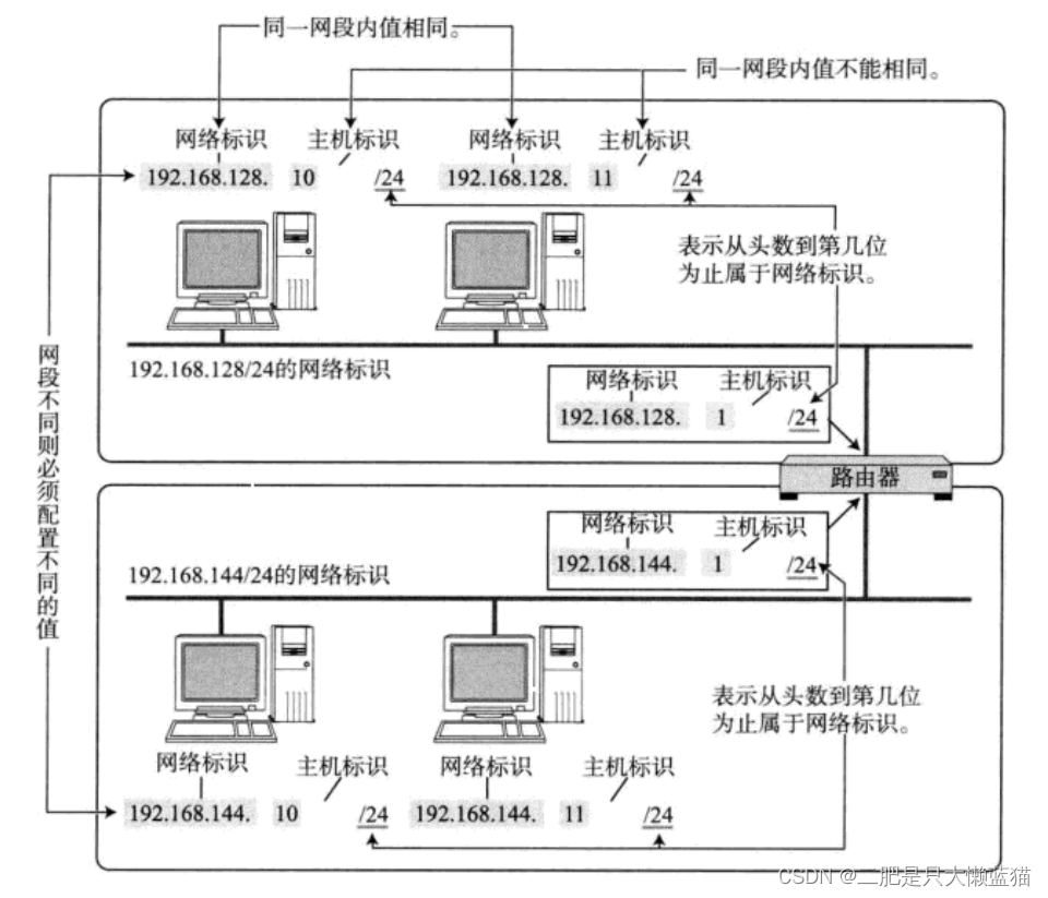 网络号: 保证相互连接的两个网段具有不同的标识。 主机号: 同一网段内,主机之间具有相同的网络号,但是必须有不同的主机号。