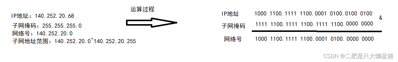 可见,IP地址与子网掩码做与运算可以得到网络号, 主机号从全0到全1就是子网的地址范围。IP地址和子网掩码还有一种更简洁的表示方法,例如140.252.20.68/24,表示IP地址为140.252.20.68, 子网掩码的高24位是1,也就是255.255.255.0。