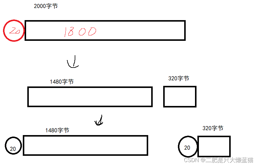 这个2000字节的数据包,20字节是报头,1800字节是数据。在分片后,每一个分片的数据需要重新加上相同的报头,也就是说,分片出来的数据,最大为1480字节,然后加上20字节的报头!