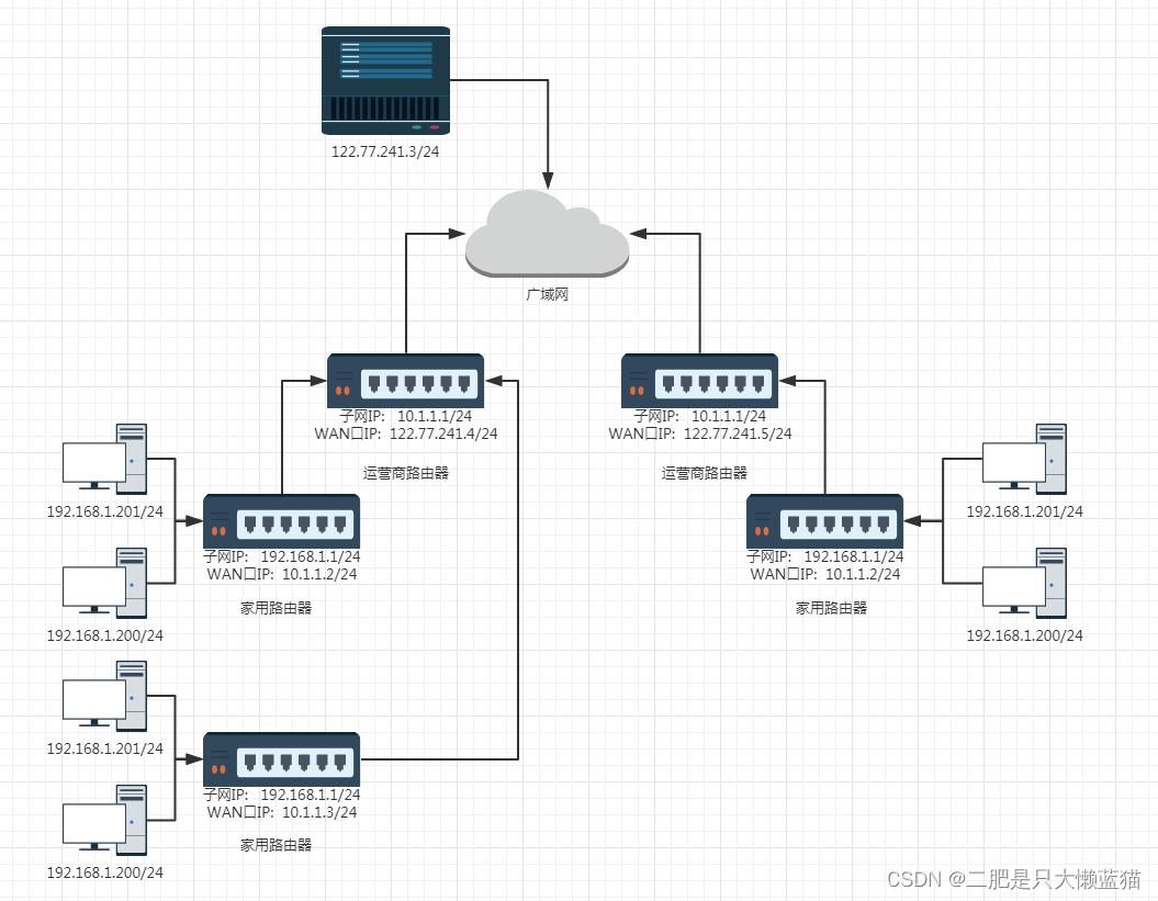 假设子网内的一个主机需要和服务端进行通信,那么这个主机发送的数据带着源IP和目的IP出发了!从主机开始走到家用路由器,由跋山涉水地走到运营商路由器,最后走到服务端。OK,此时服务端需要返回响应给主机,但是却发现由许多主机的IP都是192.168.1.201。这下子,怎么办?