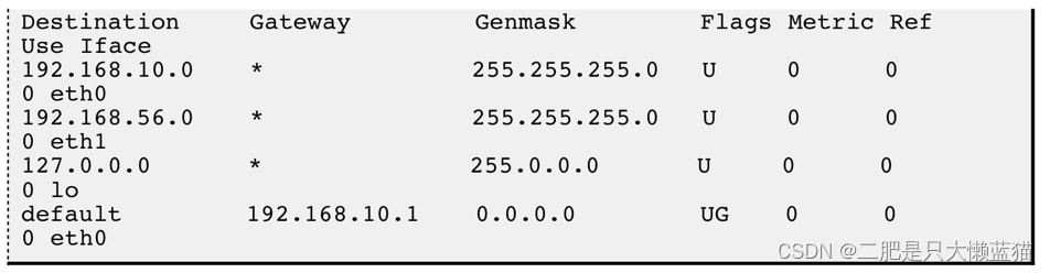 如果要发送的数据包的目的地址是192.168.56.3跟第一行的子网掩码做与运算,得到192.168.56.0,与第一行的目的网络地址不符再跟第二行的子网掩码做与运算得到192.168.56.0,正是第二行的目的网络地址,因此从eth1接口发送出去。由于192.168.56.0/24正 是与eth1 接口直接相连的网络,因此可以直接发到目的主机,不需要经路由器转发。