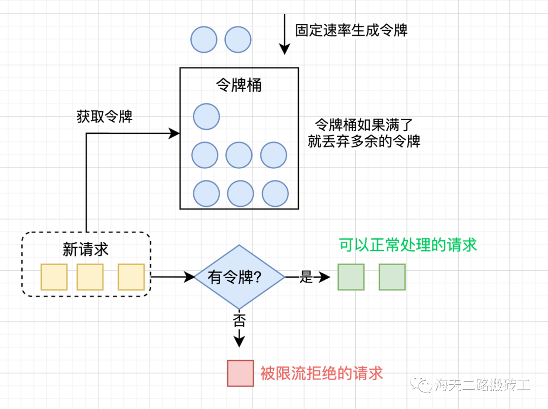 令牌桶算法是流量控制算法中的一种。它采用令牌来控制流量大小,请求到来时需要费掉一个令牌才能被服务端处理。通俗来说,令牌桶向桶里放一个个令牌,每来一个请求需要先获取一个令牌(即请求检查令牌桶中是否还有token),如果令牌桶中没有令牌,请求会被丢弃或者排队等候。