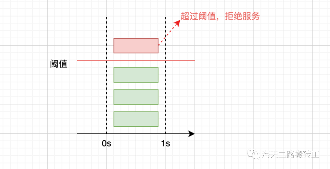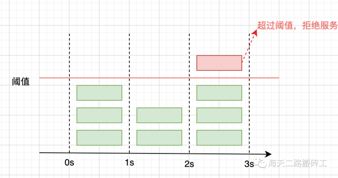 假设系统的负载能力阈值是每秒3个请求,如图,第四个请求就会被拒绝。