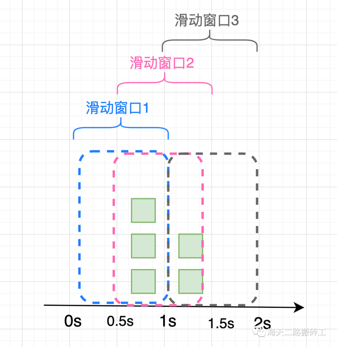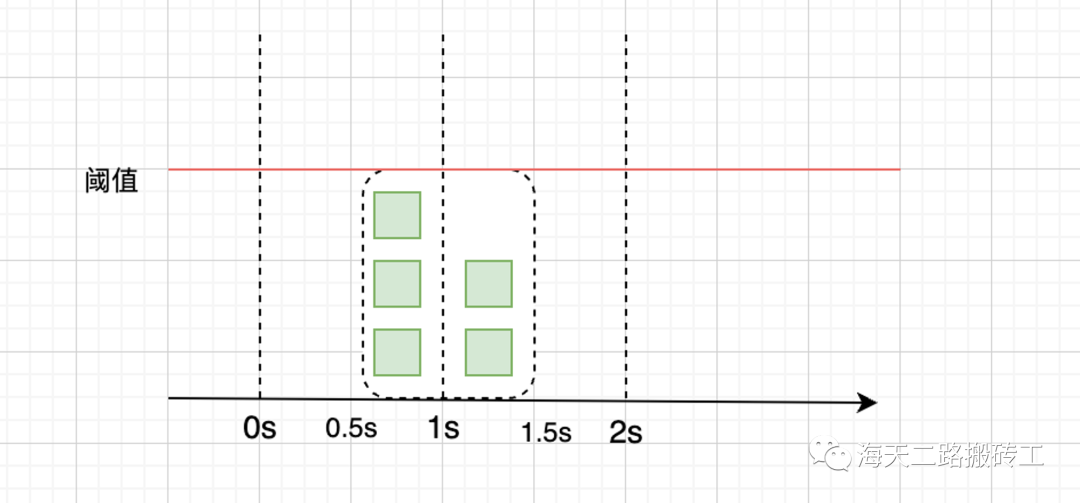 在前面固定窗口的例子中,[0, 1],[1,2]这两个区间都没有超过阈值的请求,但是如果请求都集中在[0.5,1.5]则可能会导致系统过载。