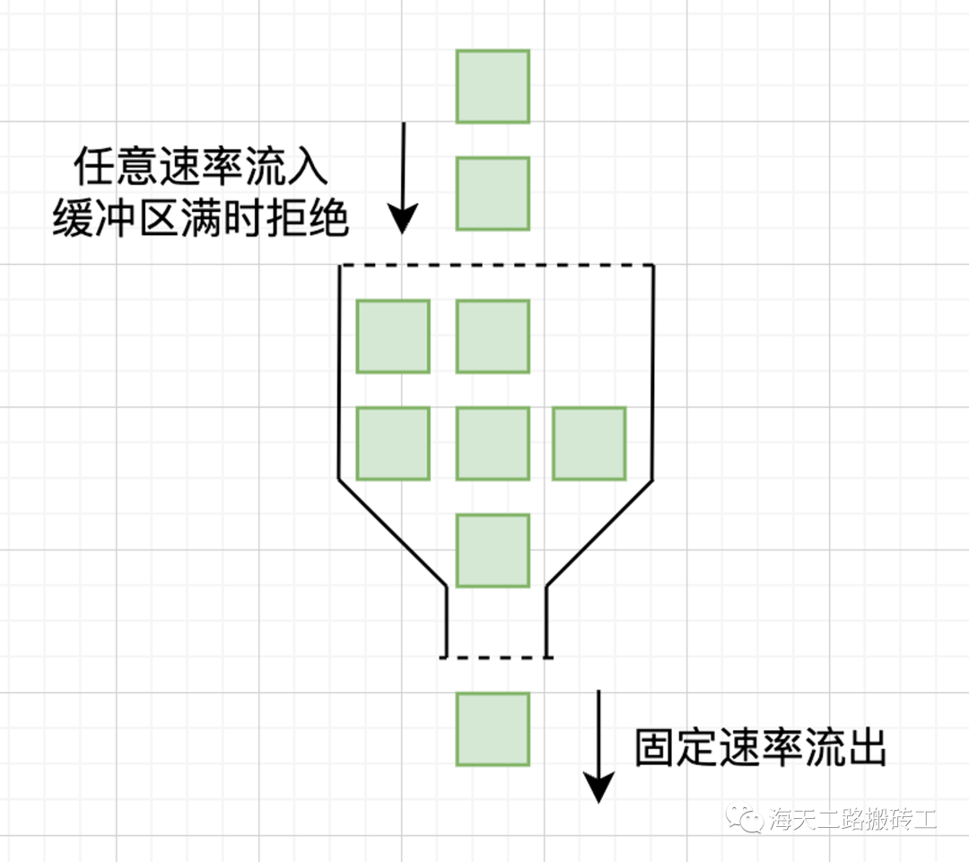 漏桶算法(Leaky Bucket Algorithm)是常见的限流算法之一,也是一种固定速率算法。漏桶被看作一个固定容量的桶,请求则被视为一些水滴。桶底上面有一个下水道,桶内的水会以固定的速度流出。如果有请求涌入而漏桶已经满了,请求将被拒绝或队列等待处理。