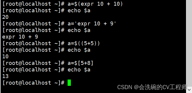 a=$(expr 10 +5) a='expr 10 + 9' (×) a=$((5+5)) a=$[5+8]