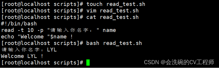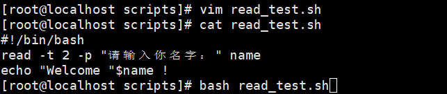 选项: -p:指定读取值时候的提示符 -t:指定读取值时候的等待时间(秒) 如果不添加 -t 表示一直等待 参数: 变量:指定读取值的变量名