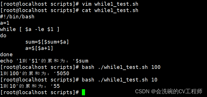 #!/bin/bash a=1 while [ a -le 1 ] do sum=[sum+a] a=[a+1] done echo '1到'1’的累和为:‘