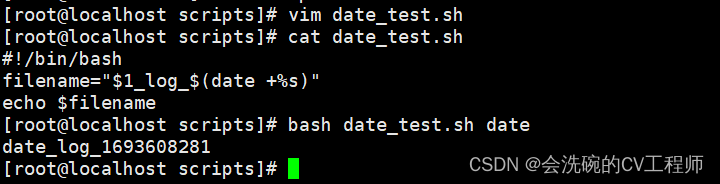 例子:比如说我们用一个脚本,输入一个参数,并以该参数加入时间戳赋予一个变量,并将该变量输出显示:
