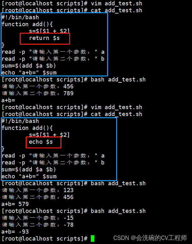 #!/bin/bash function add(){ s=[1 + 2] echo s } read -p "请输入第一个参数:" a read -p "请输入第二个参数:" b sum=(add a b) echo "a+b="