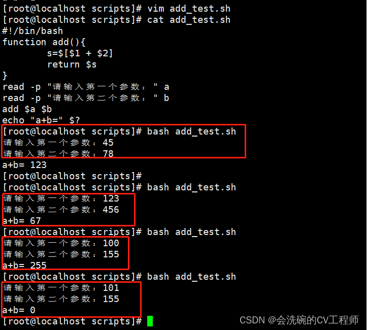 看上图,此时虽然实现了功能,但是如果此时用$?的话超于255的数就不正确了,因此我们可以用一个变量来存储返回值