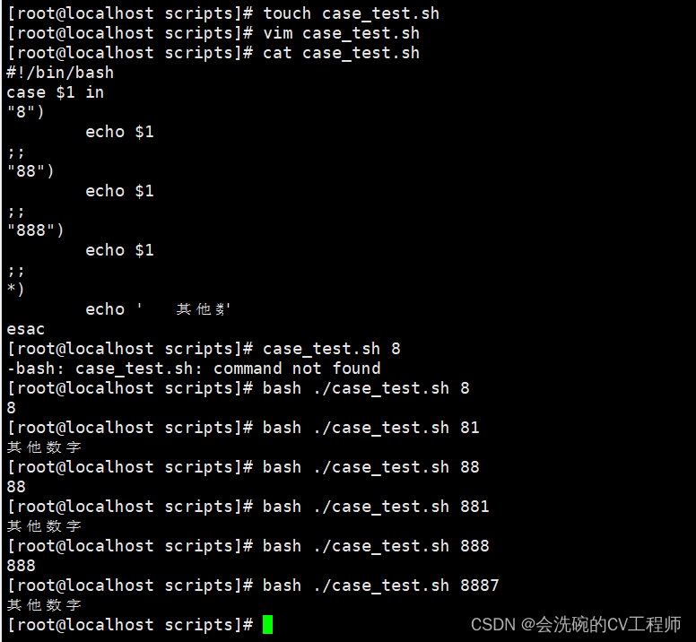 case行结尾必须为单词"in",每一个模式匹配必须以右括号")"结束 双分号 ";;" 表示命令序列结束,相当于跳出当前判断语句 最后 "*)" 表示默认模式结尾,不符合最终的出口