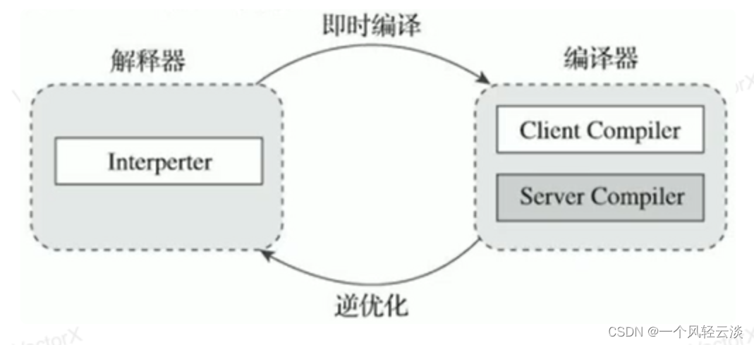 -Xint:完全采用解释器模式执行程序;-Xcomp:完全采用即时编译器模式执行程序。如果即时编译出现问题,解释器会介入执行-Xmixed:采用解释器+即时编译器的混合模式共同执行程序。JIT的编译器还分为了两种,分别是C1和C2,在HotSpot VM中内嵌有两个JIT编译器,分别为Client Compiler和Server Compiler,但大多数情况下我们简称为C1编译器 和 C2编译器。开发人员可以通过如下命令显式指定Java虚拟机在运行时到底使用哪一种即时编译器,如下所示: