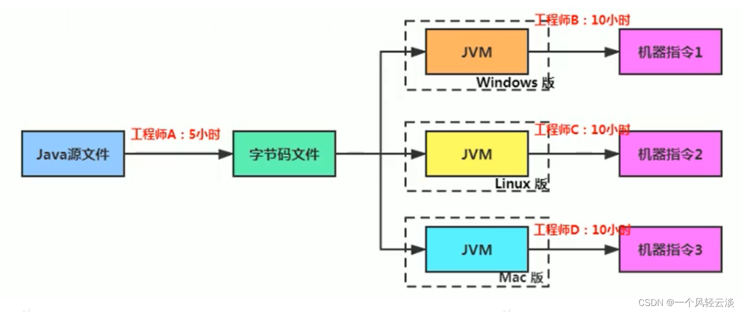 为什么Java源文件不直接翻译成JVM,而是翻译成字节码文件?Java源文件被翻译成字节码文件的原因是,字节码文件可以在任何操作系统或设备上运行,而不必重新编译源代码。字节码是一种高级程序代码,它被设计成便于在虚拟机(Virtual Machine)上进行执行,并解决了在不同平台上编译和执行Java代码的兼容性问题。如果Java源文件直接翻译成JVM,那么不同的操作系统和设备将需要不同的翻译器才能运行程序,从而使Java程序的可移植性和兼容性大大降低。因此,翻译为字节码文件是Java编程语言的一个核心特性。而且效率太低,难度大解释器真正意义上所承担的角色就是一个运行时“翻译者”,将字节码文件中的内容“翻译”为对应平台的本地机器指令执行。