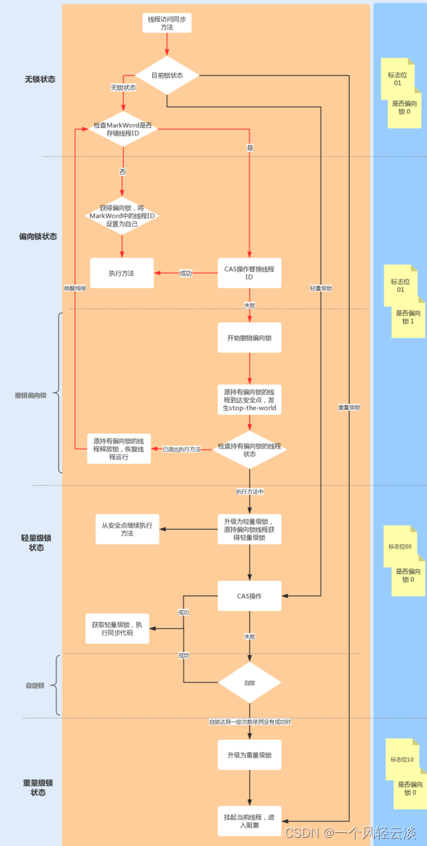 主要目的: 在没有多线程竞争的前提下,通过CAS减少重量级锁使用操作系统互斥量产生的性能消耗,说白了先自旋,不行才升级阻塞。