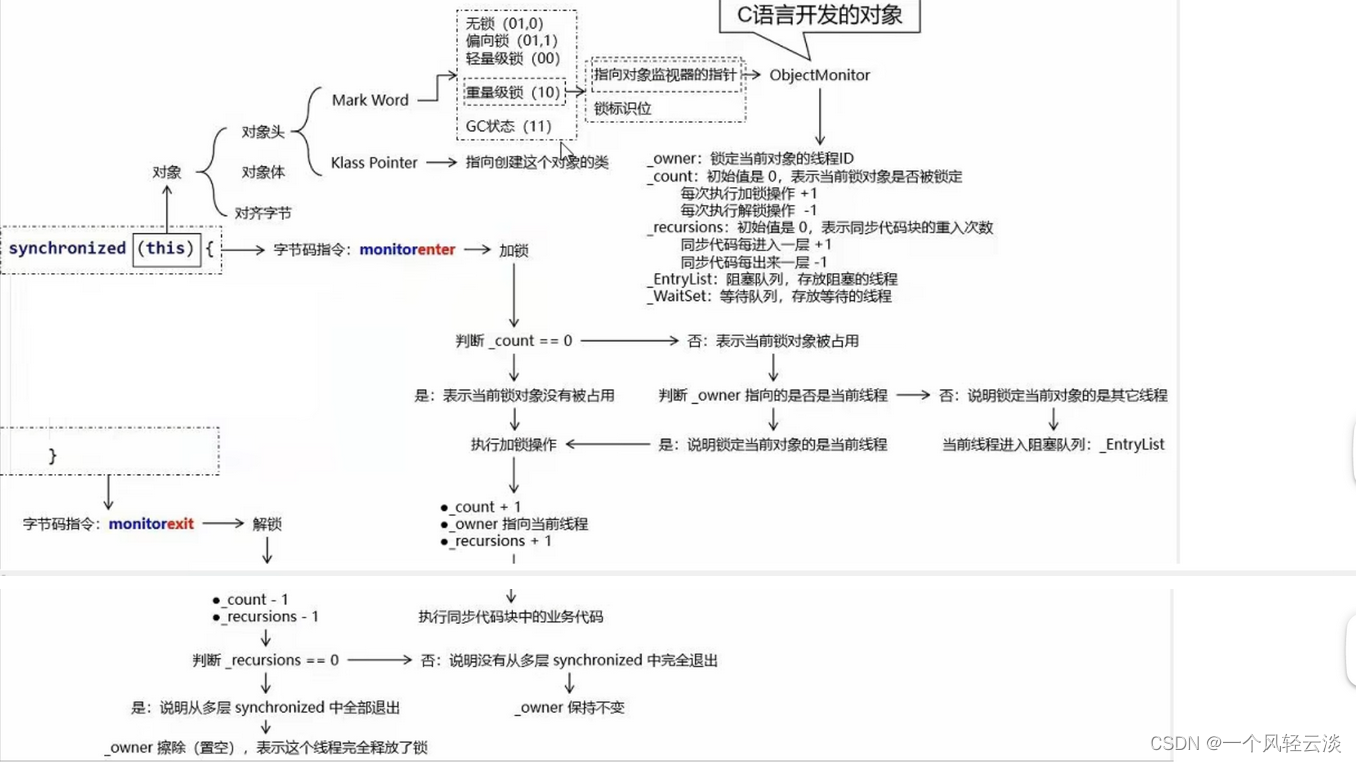 同步代码块是使用monitorenter和monitorexit指令进行同步的。monitorenter指令是在编译后插入到同步代码块的开始位置,而monitorexit是插入到方法结束处和异常处,JVM要保证每个monitorenter必须有对应的monitorexit与之配对。任何对象都有一个monitor与之关联,并且一个monitor被持有后,它将处于锁定状态。线程执行到monitorenter指令时,将会尝试获取对象的monitor所有权,即尝试获取对象的锁。