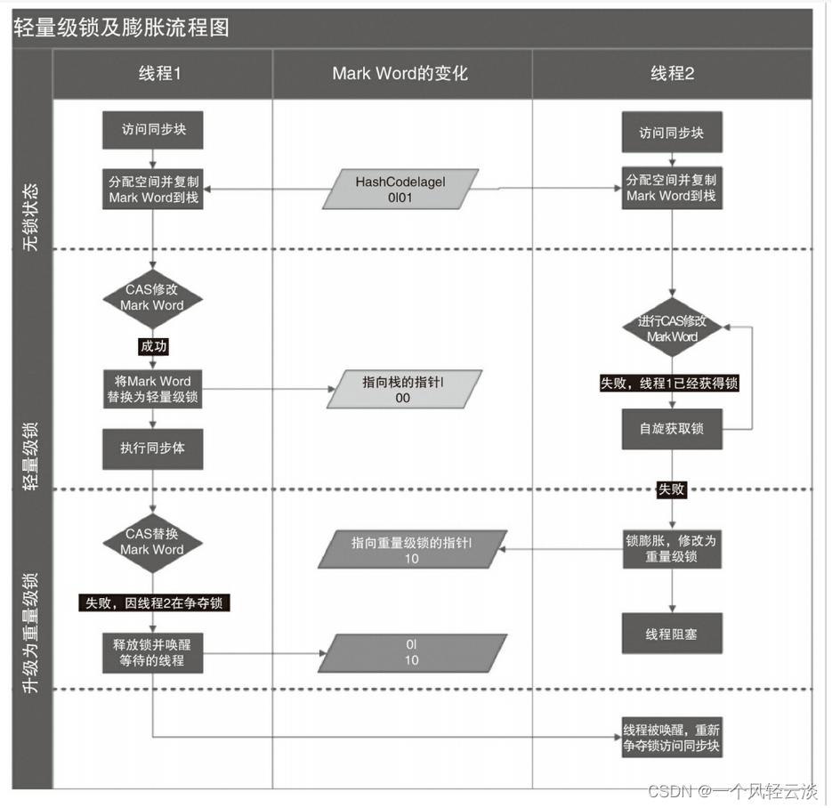 发布Java早期版本中,synchronized属于重量级锁,效率低下,因为监视器锁(montor)是依赖于底层的操作系统的MutexLoCK(系统工斥量)来实现的,挂起线程和恢复线程都需要转入内核态去完成,阻塞或唤醒一个Java线程需要换作系统切换CPU状态来完成,这种状态切换需要耗费处理器时间,如果同步代码块中内容过于简单,这种切换的时间可能比用户代码执行的时间还长”,时间成本相对较高。这也是为什么早期的synchronized效率低的原因Java 6之后,为了减少获得锁和释放锁所带来的性能消耗,引入了轻量级锁和偏向锁