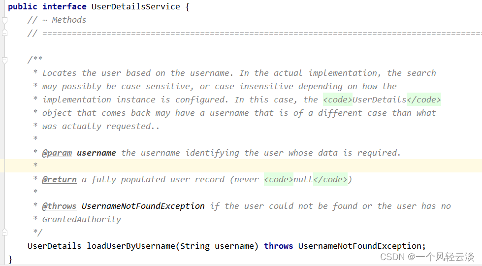 如果需要自定义逻辑时,只需要实现 UserDetailsService 接口即可。接口定义如下: