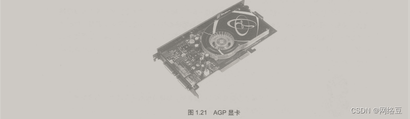 显卡主要由显示芯片,显存,数模转换器,与主板的接口等几部分组成,与显示器配合输出图像,文字等内容,显卡的作用是将计算机系统所需要是示的信息进行转换,并向显示器提供行扫描信号。由此来控制显示器所显示的内容,显卡是连接显示器和计算机主板的重要元件,是“人机对话”的中间桥梁。AGP显卡如图1.21所示,PCI-E显卡如图1.22所示。