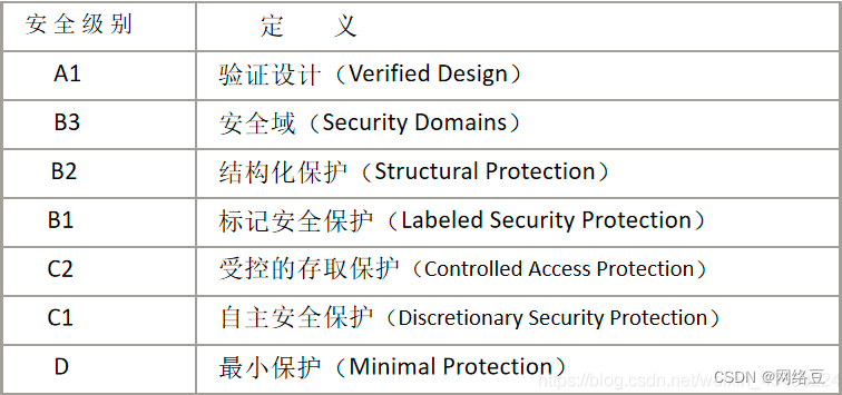 如图所示,TCSEC定义了7个等级(D.C1.C2.B1.B2.B3.A1)组成的4个类别.类A中的级别A1是最高安全级别,类D中的级别D是最低安全级别。类别用来度量提供安全保护的程度,每一个级别和类别都是在前一个基础上增加条款形成的。