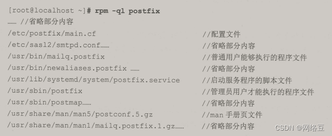 下面以CentOS中已经安装的postfix软件包(一款邮件服务器程序)为例,展示服务器应用程序的文件组成,执行“rpm-ql postfix命令,可以查看postfix软件包在系统中安装的目录和文件清单(关于rpm命令的详细用法将在下节详细讲解),具体操作如下: