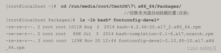 例如,以下操作用于查看DVD光盘设备中携带的bash和fontconfig-devel 软件包(分别是Shell解释器,字体配置和定制库)。一般情况下,CentOS启动后安装光盘会自动挂载到系统的