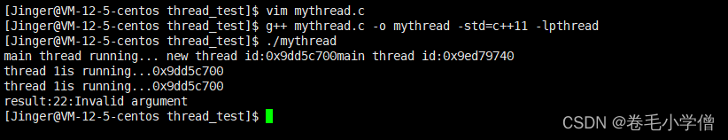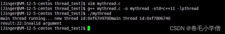 这里编译运行需要注意的是,pthread_create接口是库提供给我们的,我们使用的接口如果不是语言上的接口或者操作系统的接口,而是库提供的接口,那么在编译的时候是无法通过的,需要链接这个库才能编译成功。要链接这个库首先要找到这个库,-L:找到库在哪里;-l:找到头文件在哪里,库已经在系统中安装好了,所以除了高所系统库和头文件在哪里以外,还要知道是链接哪一个库(库名字)。