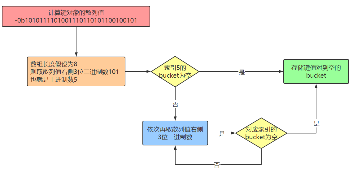 '-0b1010111101001110110101100100101'由于数组长度为8,我们可以拿计算出的散列值的最右边3位数字作为偏移量,即“101”,十进制是数字5。我们查看偏移量5,对应的bucket是否为空。如果为空,则将键值对放进去。如果不为空,则依次取右边3位作为偏移量,即“100”,十进制是数字4。再查看偏移量为4的bucket是否为空。直到找到为空的bucket将键值对放进去。流程图如下: