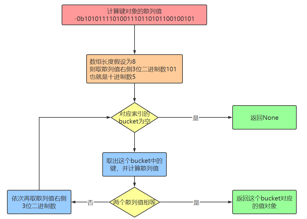 '-0b1010111101001110110101100100101'和存储的底层流程算法一致,也是依次取散列值的不同位置的数字。 假设数组长度为8,我们可以拿计算出的散列值的最右边3位数字作为偏移量,即101,十进制是数字5。我们查看偏移量5,对应的bucket是否为空。如果为空,则返回None。如果不为空,则将这个bucket的键对象计算对应散列值,和我们的散列值进行比较,如果相等。则将对应“值对象”返回。如果不相等,则再依次取其他几位数字,重新计算偏移量。依次取完后,仍然没有找到。则返回None。流程图如下: