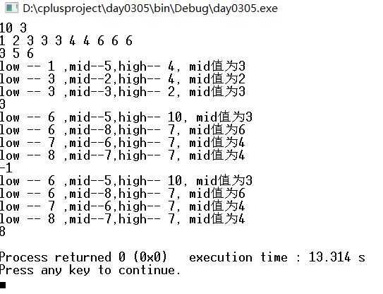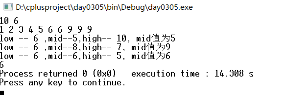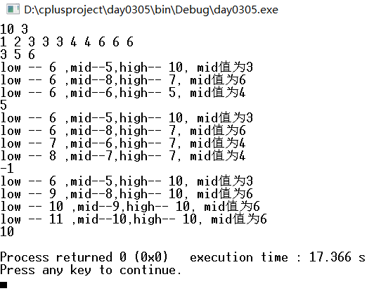 printf("low -- %d ,mid--%d,high-- %d, mid值为%d\n",low,mid,high,a[mid]);
