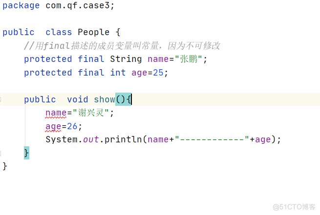 people.setName("谢兴灵"); //可以修改成功是因为final修饰的对象只是不允许重新new,而没有不允许修改属性值