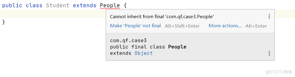 用final修饰的类,这个类不能被继承,final修饰的是类,类中的方法要自动拥有final的特性。