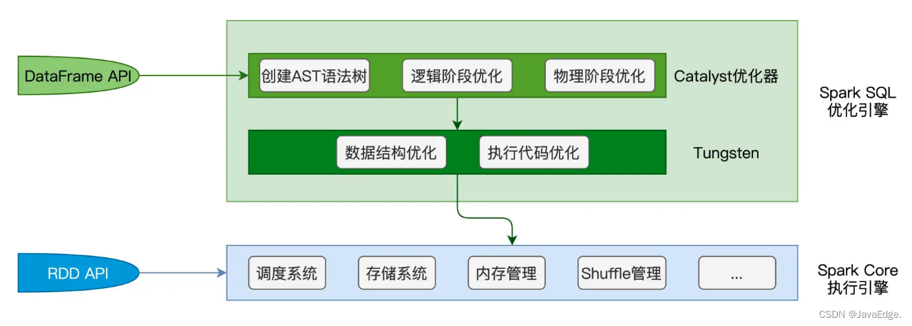 举例来说,在Hive on Spark的集成方式中,Hive在将SQL语句转换为执行计划之后,还需要把执行计划“翻译”成RDD语义下的DAG,然后再把DAG交付给Spark Core付诸执行。从第14讲到现在,我们一直在强调,Spark SQL除了扮演数据分析子框架的角色之外,还是Spark新一代的优化引擎。