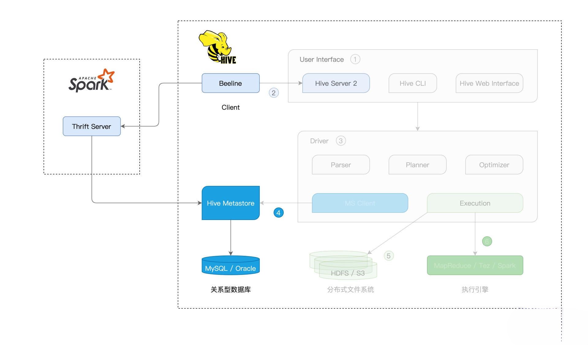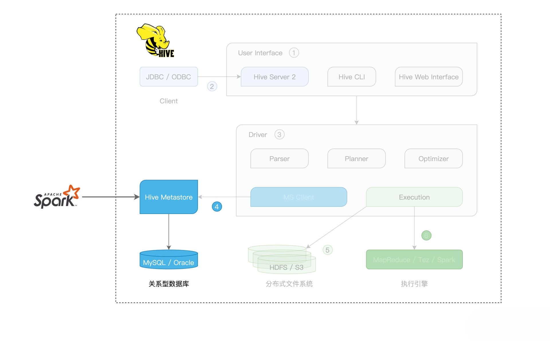 SparkSession + Hive Metastore这种集成,Spark对Hive的访问,仅涉及Metastore,对Hive架构其他组件,Spark并未触及。即Spark仅“白嫖”Hive的Metastore,拿到数据集的元信息后,Spark SQL自行加载数据、处理: