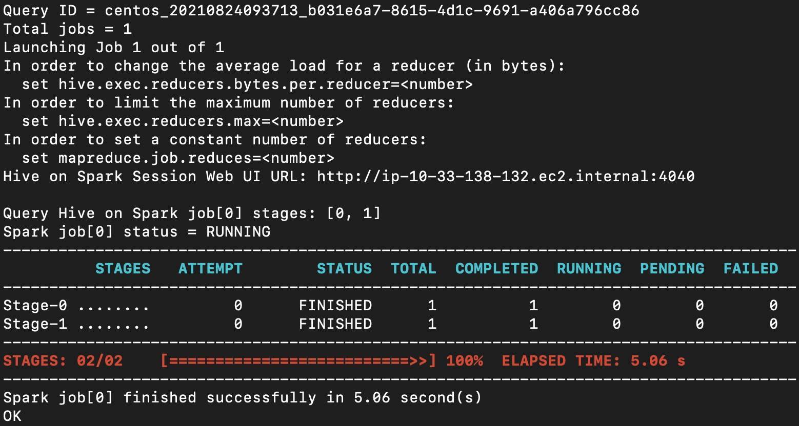 当你在终端看到“Hive on Spark”的字样时,就证明Hive后台的执行引擎确实是Spark,如下图所示。