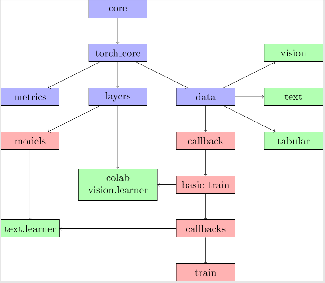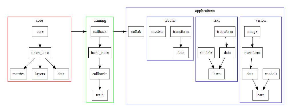图片载自fastai官网,由上图可知,从左到右分别是核心代码、训练代码和应用代码,其中的关系可以由图标很清晰地得到。