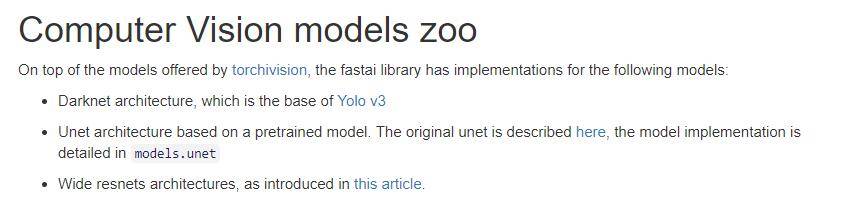 fastai使用的深度学习内核是Pytorch,因此fastai中有torchvision中常用的训练好的模型,例如resnet系列、vgg系列以及densenet系列。可以直接拿来使用。