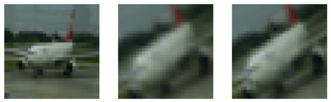 如下面的图像,最左边是原图,中间是使用传统图像增强技术变换后的,而最右边是使用fastai库进行变化的。可以发现最右边的旋转放大(rotate and zoom)后的飞机的窗户仍然可以看出来,而中间图像-变换后飞机的窗户就比较模糊。懂深度学习的同学应该知道数据集好坏对结果的好坏影响还是比较大的。