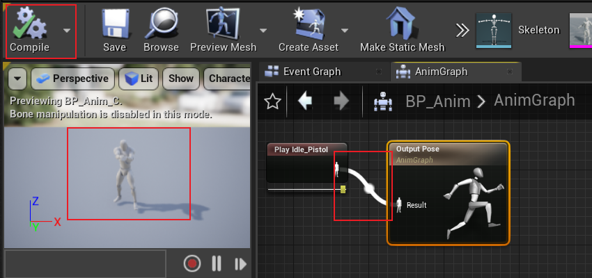 此时点击「Compile」按钮,会发现动画节点和 Output Pose 节点之间的连线亮起,在预览面板中可以看到动画播放的效果:
