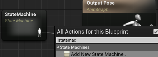 但这样的连接并不能实现状态的转换,例如在点击蹲下后将角色动画切到蹲下的动画。在 animation blueprint 中,我们通过状态机来实现这样的转换功能。删除刚刚添加的动画节点,然后右键添加一个 State Machine 节点,并将其输出连接到 Output Pose 的输入上: