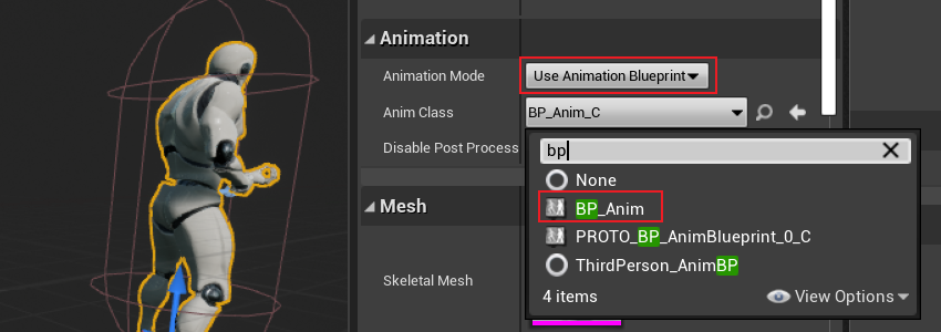 在制作好前面的动画后,我们可以打开 Ue4ASP_Character 蓝图,在 Viewport 面板中选中我们的角色模型,然后在右侧的 Details 面板中找到 Animation 一节,将其中的「Animation Mode」改为「Use Animation Blueprint」,再将「Anim Class」改为刚刚制作的动画 BP_Anim :