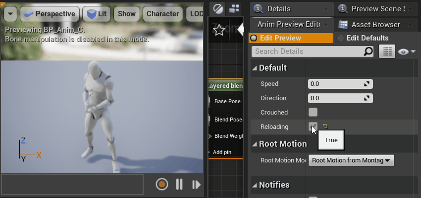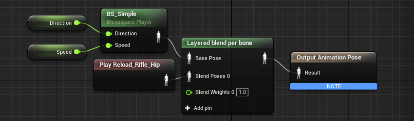 打开之前使用的 BP_Anim 蓝图,基于 Normal 节点拖出一个新节点,命名为 Reload。然后新增一个变量 Reloading 用于作为状态切换的指示,这个过程和之前切换蹲下是类似的。双击进入 Reload 节点进行编辑,首先,在这里增加一个 Layered blend per bone 节点,这个节点允许我们以某个骨骼为界来按一定比例混合多个动画。这里我们将输入的 Base Pose 设为我们之前在通常状态下使用的动画,而 Blean Poses 0 则使用装弹动画 Reload_Rifle_Hip 。这个混合节点还允许我们混合更多动画,并分别设置混合的权重,不过由于我们希望在装弹时上半身完全使用装弹动画,因此我们也无需增加混合内容,而权重我们也只需要保持为 1 即可: