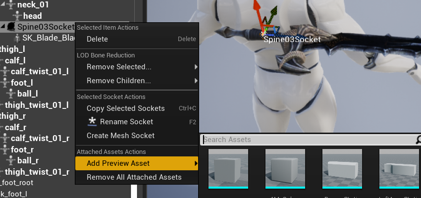 不过这样我们还是不太好看清楚实际使用时候的效果,我们可以右键点击 Spine03Socket ,在菜单中选择「Add Preview Asset」来添加一个预览模型,这个模型只会在这里被预览,不会影响实际运行的效果。我们简单加入一把刚刚导入的剑模型,这样我们就可以比较直观地调整 socket 的位置、缩放等属性了: