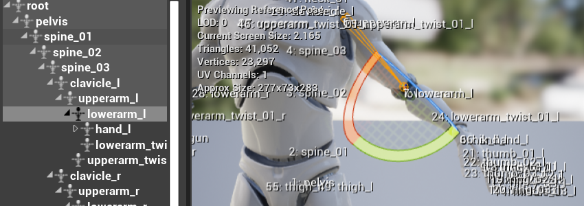 0 or 1 :自己和所有子骨骼完全参与混合N > 1 :逐层子骨骼递增混合比例,直到第 N 层混合到 100%,后续都是 100%-1 :只有自己参与混合,所有子骨骼不混合假设我们想让角色左下臂不要混入装弹动画,那么我们可以在 skeleton 中找到左下臂对应骨骼,这里看到是 lowerarm_l :