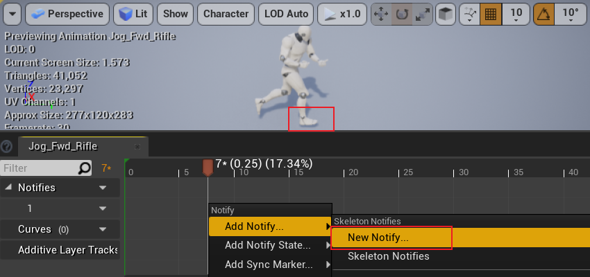 继续拖动进度条,在左脚碰到地面的位置添加 LeftFoot 的 notify。Animation notify 也是和 skeleton 绑定的,在添加同名 notify 时,我们不点「New Notify…」而是从「Skeleton Notifies」中找到已经存在的名字。添加完后轨道如下: