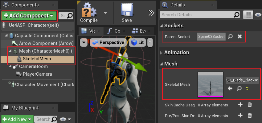 我们可以根据预览效果逐步调节参数优化效果,在效果满意后自然就是去应用这个 socket 了。打开角色蓝图,点击左上角的「Add Component」按钮添加一个 skeletal mesh,将它挂在 Character Mesh 下。然后,在左侧的 Details 面板中设置 Parent Socket 为 Spine03Socket 并将其 mesh 设置为刚刚我们添加的剑模型: