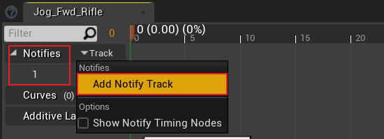有时我们希望基于动画播放状态来实现特定逻辑。比如在播放跑步动画时,我们可能会需要在角色脚接触到地面的时候播放脚踏地面的音效,这就需要我们在动画播放的过程中监视动画播放的状态。UE 通过 animation notify1 来实现这一点。打开 Jog_Fwd_Rifle 动画,这是我们之前在学习 blend space 时用到的动画。打开后,可以看到预览界面的下方有一组轨道,在这里的左侧可以看到一个「Notifies」组,这里就是 animation notify 的轨道,默认情况下应该有一个名为「1」的轨道供我们直接使用。如果监听事件比较多,我们也可以根据需要添加更多轨道: