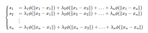 假设空间中存在 n 个已知点的颜色,用 x_i 表示第 i 个已知点,我们希望在给出空间中任意一点 y 的位置时,计算该点的颜色,我们就可以使用 RBF 插值来实现。显然,这里应该将这 n 个已知点的位置互相进行计算,形成 n 个方程,未知数就是前面提到的 \lambda :