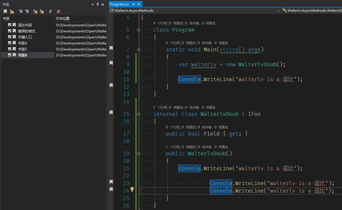 Ctrl + K, Ctrl + K 为当前行加入到书签或从书签中删除 Ctrl + K, Ctrl + P 切换到上一个书签 Ctrl + K, Ctrl + N 切换到下一个书签 Ctrl + K, Ctrl + L 删除所有书签(会有对话框提示的,不怕误按)