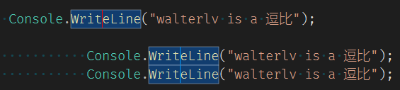 Ctrl + D 查找下一个相同的标识符,然后放一个新的脱字号(或者称作输入光标)(多次点按可以在相同字符串上出很多光标,可以一起编辑,如下图) Ctrl + Insert 查找所有相同的标识符,然后全部放置脱字号(如下图)